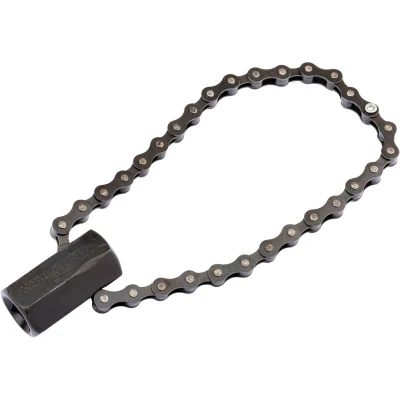General description This is a heavy-duty chain oil filter wrench designed for easy removal and installation of oil filters. It features a tightening nut that can be operated with a 1/2" square drive or a 24mm wrench, providing versatile usage options. The wrench is equipped with a 130mm capacity chain, making it suitable for various filter sizes. It is supplied in display packaging for convenient retail presentation. Technical specifications Chain capacity: 130mm Operation: with 1/2" square drive or 24mm wrench Type: Heavy-duty chain oil filter wrench Compatibility and accessories Compatible with oil filters requiring a chain size up to 130mm Operable with standard 1/2" square drive tools or 24mm wrenches Installation Wrap the chain around the oil filter Insert the tightening nut into the chain link Use a 1/2" square drive or 24mm wrench to tighten or loosen the chain for removal or installation Usage Securely position the chain around the oil filter Operate the tightening nut with a