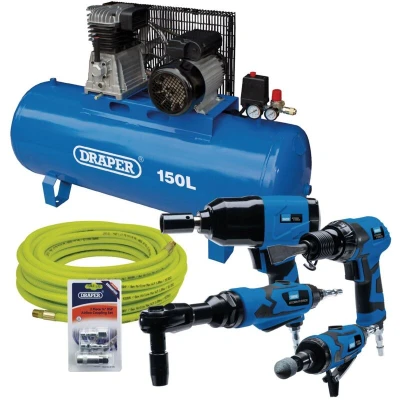 An indispensable air tool kit designed to provide all the essentials for the workshop accompanied by a belt driven compressor with thermal motor protection overload, on/off pressure switch, pressure regulator and pressure gauge, quick euro coupling outlet, a PVC air line hose suitable for workshop and industrial user, and a quick release action coupler with male and female threaded adaptors to provide the user with maximum versatility.