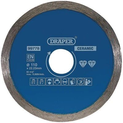 General description This is a hardened and tempered diamond blade with a continuous rim designed for smooth cutting finishes. It is ideal for cutting ceramic and natural stone tiles. The blade can be used for both dry and wet cutting, with optimal results when used wet. Technical specifications Diameter: 110mm Bore size: 22.23mm Segment height: 7mm Maximum speed: 13,800rpm Kerf: 1.8mm Blade construction: Sintered Weight: 0.073kg Compatibility and accessories Compatible with most angle grinders and tile cutting machines with a 22.23mm bore Installation Ensure the blade is properly mounted onto the tool with the bore aligned correctly Use appropriate safety gear during installation and operation Usage Use wet for best cutting performance and to prolong blade life Ensure the material is securely fixed before cutting Operate the tool at the maximum recommended speed for safety and efficiency Other information This diamond blade is suitable for cutting ceramic and natural stone tiles,