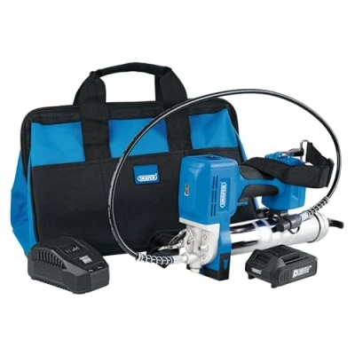 AmazonPart of the D20 multi-tool battery system The gun features a multifunction LCD display showing battery status, pumping speed and grease output in grams or ounces Designed to work with bulk filled grease or cartridges of 400g and 450g, the gun has high/low speed options and features an LED worklight and error alarm Manufactured with a chromed steel canister, 42" (1,090 mm) reinforced delivery hose and high-pressure grease nipple, the gun delivers an impressive 10,000psi output with flow rates of up to 100g/min on low speed and 170g/min on high speed Draper 24 months parts and labour warranty Flow rates are up to 100g/min on low speed and 140g/min on high speed Supplied with a D20 charger and 2.0Ah Li-ion battery inside a canvas tool bag, Weight: 12.12542441 pounds, Manufacturer: Draper