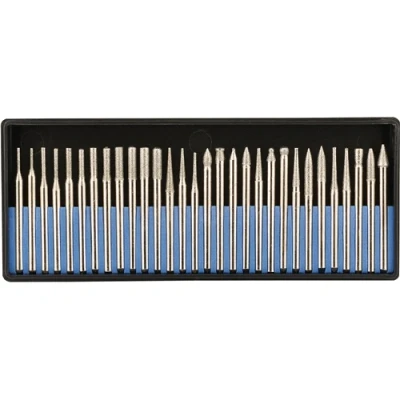General description This is a 30-piece diamond-coated burr set designed for use with a rotary tool. The burrs feature a 1/8" shank and are suitable for working with a variety of materials including ceramics, glass, plastic, fiberglass, steel, aluminum, and wood. The set is packaged for display and easy organization. Technical specifications Number of pieces: 30 Shank size: 1/8 inch Coating: Diamond Compatibility and accessories Compatible with most rotary tools Suitable for grinding, carving, shaping, and polishing tasks on various materials Installation Insert the burr into the rotary tool's collet or chuck Secure tightly before use Usage Use for detailed grinding, carving, or shaping on ceramics, glass, plastic, fiberglass, steel, aluminum, and wood Operate at appropriate speeds for each material to ensure safety and effectiveness