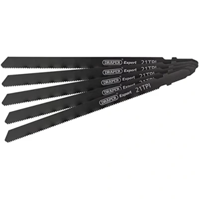General description This Draper DT318A 130mm Jigsaw Blade Set includes five bayonet fitting jigsaw blades designed for versatile cutting tasks. Made from high-speed steel, these blades feature a wave set and milled tooth design for efficient and precise cuts, making them ideal for various materials in DIY and home improvement projects. Technical specifications Blade material: High-speed steel Number of blades: 5 Fitting type: Bayonet Design features: Wave set and milled teeth Compatibility and accessories Compatible with jigsaws that accept bayonet fitting blades Installation Insert the blade into the jigsaw's bayonet fitting until it clicks into place Usage Use for cutting wood, plastic, and other materials Ensure the blade is securely fitted before operation