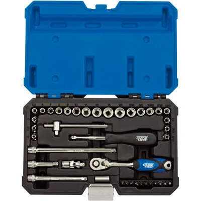 Expert Quality , six point sockets made from chrome vanadium steel that’s hardened and tempered with a micro satin finish Each socket has a knurled ring for extra grip Supplied with a 72 tooth reversible soft grip ratchet and accessories Packed in tough plastic storage case This is a Draper product.