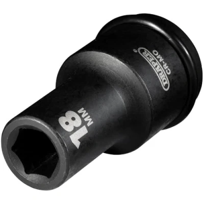 General description This is a 3/4" square drive deep impact socket designed for use with electric or pneumatic impact wrenches. Made from hardened chrome molybdenum steel, it offers durability and strength for heavy-duty applications. The socket features a black phosphate finish that provides corrosion resistance. It is part of the Draper Hi-TORQ® 6-point deep impact socket range, ensuring a secure fit on fasteners and reducing the risk of rounding. Technical specifications Size: 18mm (3/4") Drive: 3/4" square drive Type: Deep impact socket Material: Hardened chrome molybdenum steel Finish: Black phosphate for corrosion protection Compatibility and accessories Compatible with electric and pneumatic impact wrenches with a 3/4" drive Supplied with a ring and pin for secure attachment Installation Attach the socket to the impact wrench's 3/4" drive using the ring and pin for secure fitting Ensure the ring and pin are properly engaged before use Usage Use with impact wrenches for