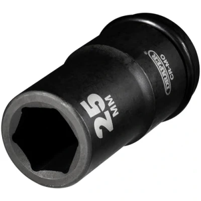 General description This is a 25mm (1 inch) deep impact socket designed for use with 3/4" square drive impact wrenches. It is forged from hardened chrome molybdenum steel for durability and strength. The socket features a black phosphate finish that provides corrosion resistance. It is suitable for use with electric or pneumatic impact wrenches, making it ideal for heavy-duty applications in DIY and home improvement projects. Technical specifications Size: 25mm (1 inch) Drive size: 3/4" Type: Deep impact socket Material: Hardened chrome molybdenum steel Finish: Black phosphate for corrosion protection Compatibility and accessories Compatible with electric and pneumatic impact wrenches with a 3/4" drive Supplied with a ring and pin for secure attachment Installation Always use the included ring and pin to secure the socket to the impact wrench's output shaft Ensure the socket is properly attached before use to prevent accidents or damage Usage Designed for tightening or loosening nuts