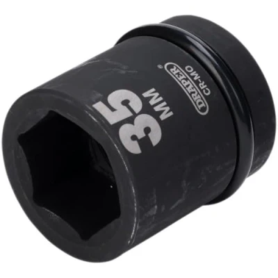 General description This is a 35mm (1 inch square drive) impact socket designed for heavy-duty use. It is part of the Draper Expert HI-TORQ® series, known for high quality and durability. The socket is forged from chrome molybdenum steel, which is hardened, tempered, and chemically blacked for corrosion resistance. It is suitable for use with air, electric, or manual impact wrenches, making it versatile for various applications. Technical specifications Size: 35 mm (1 inch square drive) Material: Chrome molybdenum steel Finish: Blackened for corrosion protection Type: 6-point socket Compatibility and accessories Compatible with impact wrenches and manual impact tools Supplied with a pin and ring for secure attachment Installation Always use the ring and pin to secure the socket to the impact wrench's output shaft. Usage Designed for tightening or loosening nuts and bolts with impact or manual tools. Suitable for professional and DIY applications requiring high torque.