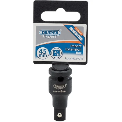 General description This is a 45mm impact extension bar designed for 3/8-inch square drive tools. It is suitable for use with impact wrenches and drivers, providing extended reach and improved access to fasteners in tight spaces. Technical specifications Length: 45mm Drive Size: 3/8 inch square Material: Chrome molybdenum steel Finish: Hardened, tempered, and chemically blacked for corrosion resistance Features: Spring-loaded ball bearing for secure socket retention Compatibility and accessories Compatible with 3/8-inch drive impact tools and sockets Suitable for use with impact wrenches and drivers Installation Insert the impact extension bar into the socket and impact tool's drive end Ensure the spring-loaded ball bearing clicks into place for secure attachment Usage Use with impact drivers or wrenches for fastening or loosening bolts and nuts Ideal for reaching fasteners in confined or hard-to-access areas Other information Expert quality, forged for durability and strength Display