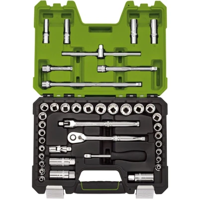 General description This comprehensive 3/8'' socket set includes a variety of high-quality tools designed for versatile use in DIY and home improvement projects. Manufactured and tested in accordance with DIN3122 and ISO3315 specifications, this set features durable sockets made from hardened and tempered chrome vanadium steel, ensuring resistance to wear and longevity. The set includes both metric and imperial sizes, along with deep sockets and spark plug sockets, making it suitable for a wide range of tasks. Technical specifications Material: Chrome vanadium steel, hardened and tempered Finish: Polished Socket types: Metric, imperial, deep sockets, spark plug sockets Socket sizes: Metric (6-22mm), imperial (1/4 to 3/4 inch), deep sockets (8, 10, 12, 13mm), spark plug sockets (10, 12, 14mm) Ratchet: 72-tooth reversible with quick release Accessories: Wobble extension bars, sliding T-bar, flexible handle, universal joint, spinner handle Storage: Plastic case with soft grip handle
