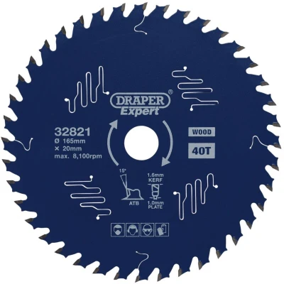 ManoManoGeneral description Draper Expert TCT Circular Saw Blade is designed specifically for cutting wood. It features a PTFE coating that reduces friction and enhances cutting performance, ensuring smooth and efficient operation. Technical specifications Diameter: 165 mm Bore size: 20 mm Teeth count: 40T
