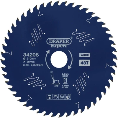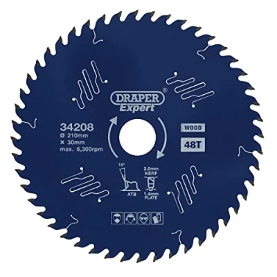 Electrical WorldThis laser cut Titanium Carbide-Tipped (TCT) circular saw blade has a PTFE coating, which improves the ease of the cut, reduces heat in the blade and prevents rusting and resin build-up. The micrograin titanium carbide teeth provide thin cuts and little waste. The heat expansion slots are laser cut and this provides the blade with enough room to expand when it heats up. Anti-friction vents tap vibrations ensuring the blade runs more true without any unbalance. These vents also limit the amount of noise from the blade, which is great for use in a quieter working environment. The anti-kickback design prevents the blade feeding too quickly. Designed for use on hardwood, softwood, MDF, chipboard and plywood. Compatible with most 210mm circular saws with a 30mm bore including Stock No. 83677. EN847-1 Standard. 1 x Draper Expert TCT Circular Saw Blade for Wood with PTFE Coating, 210 x 30mm, 48T