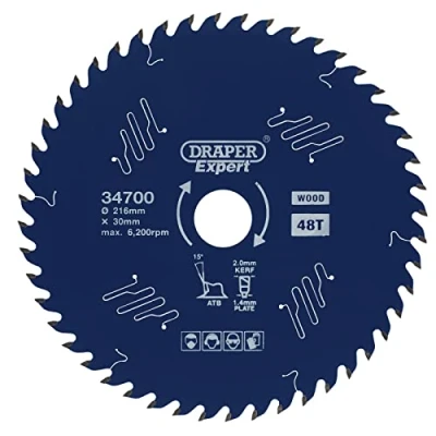 Electrical WorldThis laser cut Titanium Carbide-Tipped (TCT) circular saw blade has a PTFE coating, which improves the ease of the cut, reduces heat in the blade and prevents rusting and resin build-up. The micrograin titanium carbide teeth provide thin cuts and little waste. The heat expansion slots are laser cut and this provides the blade with enough room to expand when it heats up. Anti-friction vents tap vibrations ensuring the blade runs more true without any unbalance. These vents also limit the amount of noise from the blade, which is great for use in a quieter working environment. The anti-kickback design prevents the blade feeding too quickly. Designed for use on hardwood, softwood, MDF, chipboard and plywood. Compatible with most 216mm circular saws with a 30mm bore. EN847-1 Standard. 1 x Draper Expert TCT Circular Saw Blade for Wood with PTFE Coating, 216 x 30mm, 48T