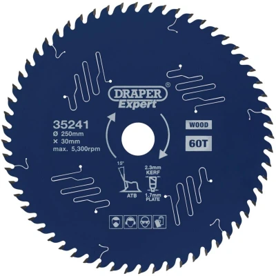 Electrical WorldThis laser cut Titanium Carbide-Tipped (TCT) circular saw blade has a PTFE coating, which improves the ease of the cut, reduces heat in the blade and prevents rusting and resin build-up. The micrograin titanium carbide teeth provide thin cuts and little waste. The heat expansion slots are laser cut and this provides the blade with enough room to expand when it heats up. Anti-friction vents tap vibrations ensuring the blade runs more true without any unbalance. These vents also limit the amount of noise from the blade, which is great for use in a quieter working environment. The anti-kickback design prevents the blade feeding too quickly. Designed for use on hardwood, softwood, MDF, chipboard and plywood. Compatible with most 250mm circular saws with a 30mm bore. EN847-1 Standard. 1 x Draper Expert TCT Circular Saw Blade for Wood with PTFE Coating, 250 x 30mm, 60T
