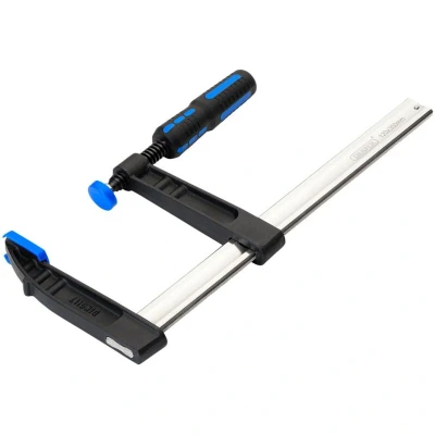 General description This F-Clamp is made from durable carbon steel with malleable cast iron jaws, all nickel-plated for corrosion resistance. It provides a strong and even clamping force of up to 450kg, making it suitable for various DIY and home improvement projects. The quick-adjust handle features a comfort grip for easy operation, while soft plastic jaw guards protect surfaces from damage. Technical specifications Maximum clamping force: 450kg Clamp length: 300mm Material: Carbon steel frame, malleable cast iron jaws, nickel plating Compatibility and accessories Suitable for woodworking, metalworking, and general clamping tasks Includes protective plastic jaw guards to prevent surface damage Installation No installation required; simply adjust the clamp to the desired width using the quick handle. Usage Open the clamp by turning the quick adjustment handle Position the jaws around the workpiece Turn the handle to tighten until the desired pressure is achieved Use the soft jaw