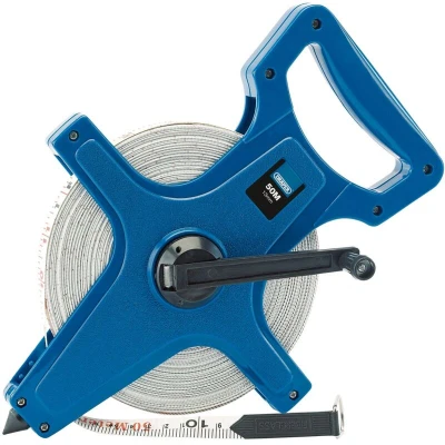Electrical WorldFibreglass tape, graduated from metres into cm/mm and inches into 1/8" on reverse. ABS plastic case with grab handle, winding handle and stainless steel eyelet on end of tape. Display packed.