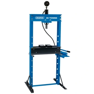 Electrical WorldRobust hydraulic 20 tonne floor press with sliding ram. There are nine adjustable table heights: 256, 366, 486, 606, 726, 846, 966, 1086 and 1106mm. The glycerine liquid filled gauge provides increased accuracy and prolonged service life. An anti-kink coil is fitted to each end of the flexible hose for increased protection. Fitted with a safety valve to pretend the press from overloading. Complete with two flat V-shaped blocks. Fully tested and certified for safe, reliable operation.