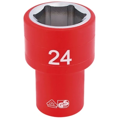 General description Expert Quality 6 point sockets manufactured from chrome vanadium steel, hardened, tempered, and chrome plated. Tested to 10,000V for safe live working at 1000V AC or 1500V DC. Sold loose. Technical specifications Socket size: 24mm Material: Chrome vanadium steel Voltage test: 10,000V Safe working voltage: 1000V AC or 1500V DC