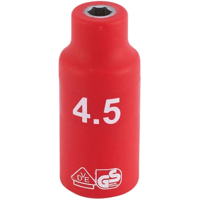General description Expert Quality 6 point sockets manufactured from chrome vanadium steel, hardened, tempered, and chrome plated. Tested to 10,000V for safe live working at 1000V AC or 1500V DC. Technical specifications Socket drive: 1/4 inch Socket size: 4.5mm Material: Chrome vanadium steel Voltage test: 10,000V Safe working voltage: 1000V AC or 1500V DC Other information Sold loose