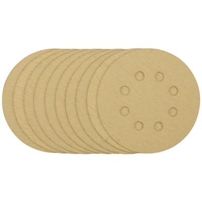 General description Pack of 10 gold sanding discs made from aluminium oxide with a special treatment of calcium stearate, which is resin bonded to provide self-sharpening and anti-clogging performance. The heavy-duty D-Weight backing paper enhances durability, making the sanding disc suitable for the toughest jobs. The hook and loop backing allows for quick and easy changes of sanding discs, while the eight pre-punched 8mm holes improve dust extraction during sanding. These discs are ideal for sanding and finishing wood, metals (including ferrous alloys), painted surfaces, varnish, plastic, and fillers. Technical specifications Size: 125mm Material: Aluminium oxide Abrasive connection: Resin bonded Backing type: Hook & Loop Backing weight: D-Weight Compatibility and accessories Compatible with all 125mm random orbit sanders with a hook and loop backing pad Compatible with Draper Stock No. 58097 and 89522