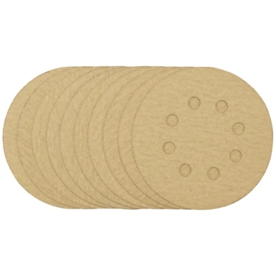 Pack of 10 gold sanding discs made from aluminium oxide with a special treatment of calcium stearate which is resin bonded to provide self-sharpening and anti-clogging performance. The heavy-duty D-Weight backing paper makes the sanding disc more durable - able to withstand the toughest jobs. The hook and loop backing offers decent adhesion to facilitate the fast changing of sanding discs. The eight pre-punched 8mm holes improve the dust extraction during sanding. Ideal for sanding and finishing wood, metals - including ferrous alloys, painted surfaces, varnish, plastic and fillers. Compatible with all 125mm random orbit sanders with a hook and loop backing pad, including Draper Stock No. 58097 and 89522.