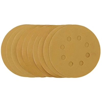 Electrical WorldPack of 10 gold sanding discs made from aluminium oxide with a special treatment of calcium stearate which is resin bonded to provide self-sharpening and anti-clogging performance. The heavy-duty D-Weight backing paper makes the sanding disc more durable - able to withstand the toughest jobs. The hook and loop backing offers decent adhesion to facilitate the fast changing of sanding discs. The eight pre-punched 8mm holes improve the dust extraction during sanding. Ideal for sanding and finishing wood, metals - including ferrous alloys, painted surfaces, varnish, plastic and fillers. Compatible with all 125mm random orbit sanders with a hook and loop backing pad, including Draper Stock No. 58097 and 89522.