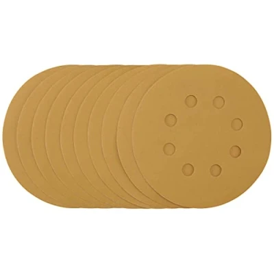 Pack of 10 gold sanding discs made from aluminium oxide with a special treatment of calcium stearate which is resin bonded to provide self-sharpening and anti-clogging performance. The heavy-duty D-Weight backing paper makes the sanding disc more durable - able to withstand the toughest jobs. The hook and loop backing offers decent adhesion to facilitate the fast changing of sanding discs. The eight pre-punched 8mm holes improve the dust extraction during sanding. Ideal for sanding and finishing wood, metals - including ferrous alloys, painted surfaces, varnish, plastic and fillers. Compatible with all 125mm random orbit sanders with a hook and loop backing pad, including Draper Stock No. 58097 and 89522.
