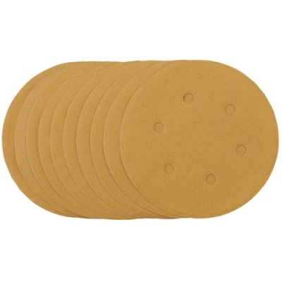 Pack of 10 gold sanding discs made from aluminium oxide with a special treatment of calcium stearate which is resin bonded to provide self-sharpening and anti-clogging performance. The heavy-duty D-Weight backing paper makes the sanding disc more durable - able to withstand the toughest jobs. The hook and loop backing offers decent adhesion to facilitate the fast changing of sanding discs. The six pre-punched 8mm holes improve the dust extraction during sanding. Ideal for sanding and finishing wood, metals - including ferrous alloys, painted surfaces, varnish, plastic and fillers. Compatible with all 150mm random orbit sanders with a hook and loop backing pad, including Draper Stock No. 65084, 83942 and 84125.