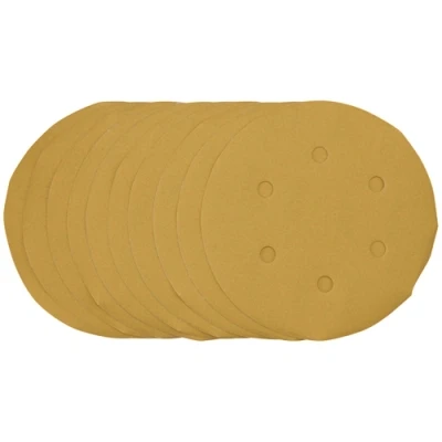 Pack of 10 gold sanding discs made from aluminium oxide with a special treatment of calcium stearate which is resin bonded to provide self-sharpening and anti-clogging performance. The heavy-duty D-Weight backing paper makes the sanding disc more durable - able to withstand the toughest jobs. The hook and loop backing offers decent adhesion to facilitate the fast changing of sanding discs. The six pre-punched 8mm holes improve the dust extraction during sanding. Ideal for sanding and finishing wood, metals - including ferrous alloys, painted surfaces, varnish, plastic and fillers. Compatible with all 150mm random orbit sanders with a hook and loop backing pad, including Draper Stock No. 65084, 83942 and 84125.