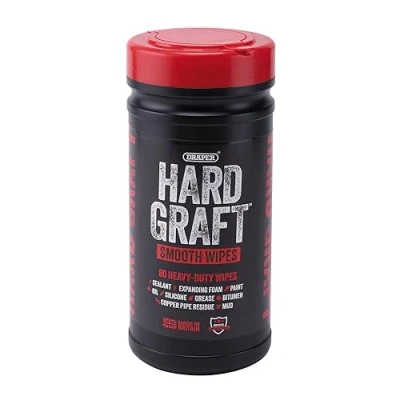 ManoManoGeneral description Hard Graft Multipurpose Smooth Wipes are heavy-duty, non-abrasive cleaning wipes designed for various workshop and tool cleaning tasks. They effectively remove sealant, expanding foam, paint, oil, silicone, grease, bitumen, copper pipe residue, mud, and more. These wipes are antibacterial and dermatologically compliant with EN1276 standards. Technical specifications Quantity: 80 wipes per pack Sheet size: 200 x 180mm Material: Non-abrasive, smooth texture Standards: Conforms to EN812 and EN1276 specifications Properties: Antibacterial, dermatologically compliant Compatibility and accessories Suitable for cleaning tools, machinery, workshop surfaces, and industrial equipment. Installation No installation required. Simply open the pack and use as needed. Usage Pull out a wipe from the pack Wipe the surface or tool to remove dirt, grease, paint, or residues Dispose of used wipes responsibly after use Other information Heavy-duty wipes suitable for industrial and