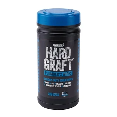 • Multi-purpose wipes designed for plumbers • Medium-abrasive texture for tough stains on one side and a smooth side for wiping hands and surfaces • Designed to remove paint, oil, silicone, PU foam, copper pipe residue, adhesives and more • Dermatologically tested and infused with aloe vera • Antibacterial and dermatologically directive compliant to EN1276 • 80 wipes per pack • Sheet size 200 x 200mmThese Hard Graft plumber's wipes are heavy duty and capable of scrubbing on the job. Each wipe has a medium-abrasive texture for tough stains on one side and a smooth side for wiping hands and surfaces. Designed to remove paint, oil, silicone, PU foam, copper pipe residue, adhesives and more. Dermatologically tested and infused with aloe vera to help keep hands soft and moisturised. Antibacterial and dermatologically directive compliant to EN1276. 80 wipes per pack. Sheet size 200 x 200mm. 1 x Draper Hard Graft Plumber's Wipes (Tub of 80)Manufactured to EN1276 specificationsTechnical Specification:Pack Quantity: 80 Product Type: WipesDimensions: Length: 245mm x Height: 100mmWeight: 0.469KgWarranty: Consumable Warranty
