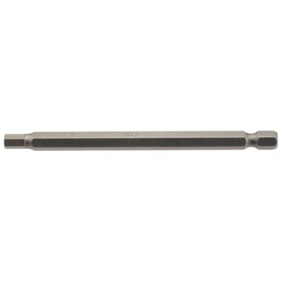 General description This is a 5mm (1/4 inch) hexagonal insert bit with a length of 100mm, designed for use with compatible screwdrivers and drill drivers. It is suitable for various DIY and home improvement tasks requiring hex bits. Technical specifications Material: Chrome vanadium steel Size: 5mm (1/4 inch) hexagonal Length: 100mm Finish: Shot blast for durability Compatibility and accessories Compatible with standard 1/4 inch hex screwdriver and drill chucks Suitable for use with various screwdriver bits and power tools Installation Insert the bit into the chuck of your screwdriver or drill until securely fitted Usage Use for driving screws with hexagonal heads Ideal for assembling furniture, installing fixtures, and general DIY projects