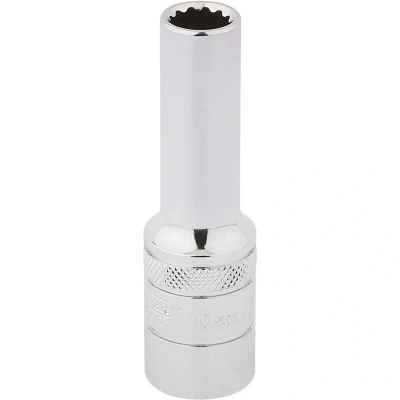 General description This 10mm deep socket is designed for 1/2-inch square drive tools, providing a secure fit for various fasteners. Made from chrome vanadium steel, it is hardened and tempered for durability and long-lasting performance. The polished chrome finish offers corrosion resistance, while the knurled ring enhances grip during use. This socket is suitable for both professional and DIY applications that require precise and reliable fastening. Technical specifications Size: 10mm Drive Size: 1/2 inch Type: Deep socket Material: Chrome vanadium steel Finish: Polished chrome Number of points: 12 Manufacturing standards: DIN3122 and ISO3315 Compatibility and accessories Compatible with 1/2-inch drive ratchets and extension bars Suitable for use with various socket wrenches and power tools designed for 1/2-inch drive Installation Attach the socket to a compatible 1/2-inch drive ratchet or extension bar Ensure the socket is securely fitted before use Usage Use for tightening or