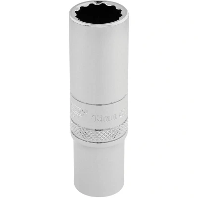 General description High-quality 12-point deep sockets made from chrome vanadium steel, ensuring durability and strength. Manufactured with a hardened and tempered process, these sockets provide long-lasting performance. The polished finish offers a professional look and easy cleaning, while the knurled ring design improves grip during use. Suitable for various automotive and mechanical applications requiring deep socket access. Technical specifications Material: Chrome vanadium steel Finish: Polished chrome Number of points: 12 Type: Deep socket Size: 13mm Drive size: 3/8 inch square Manufactured according to DIN3122 and ISO3315 standards Compatibility and accessories Compatible with 3/8 inch drive ratchets and extensions Suitable for use with various socket wrenches and tools designed for 3/8 inch drive Installation Attach the socket to a compatible 3/8 inch drive ratchet or extension Ensure the socket is securely fitted before use Usage Use for tightening or loosening nuts and