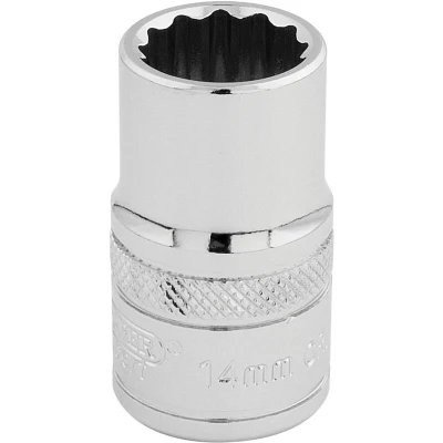 General description This 1/2" drive metric socket is made from high-quality chrome vanadium steel, ensuring durability and strength. It features a polished chrome finish for corrosion resistance and a professional appearance. The socket has 12 points for a secure grip on fasteners and a knurled ring for extra grip during use. Suitable for various DIY and home improvement tasks, it is designed to meet industry standards. Technical specifications Size: 14mm Drive Size: 1/2 inch Type: 12-point socket Material: Chrome vanadium steel Finish: Polished chrome Manufactured according to DIN3122 and ISO3315 standards Compatibility and accessories Compatible with 1/2" drive ratchets and extension bars Suitable for use with other 1/2" drive tools Installation Attach the socket to a compatible 1/2" drive ratchet or wrench Ensure the socket is securely fitted before use Usage Use for tightening or loosening nuts and bolts with a 14mm size Apply appropriate torque to avoid damage Other information