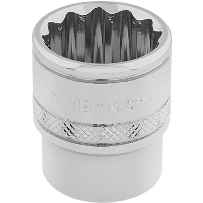 General description This 19mm 12-point socket is made from high-quality chrome vanadium steel, ensuring durability and strength. It features a polished chrome finish for corrosion resistance and a professional appearance. The socket includes a knurled ring for a secure grip during use, making it suitable for various mechanical and DIY tasks, providing reliable performance and precision. Technical specifications Size: 19mm Type: 12-point socket Drive size: 3/8 inch square Material: Chrome vanadium steel Finish: Polished chrome Manufactured according to DIN3122 and ISO3315 standards Compatibility and accessories Compatible with 3/8 inch drive ratchets and extensions Suitable for use with various socket wrenches and tools designed for 3/8 inch drive Installation Attach the socket to a compatible 3/8 inch drive ratchet or wrench Ensure the socket is securely fitted before use Usage Use for tightening or loosening nuts and bolts with a 19mm size Apply appropriate torque to avoid damage Use