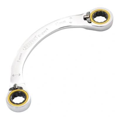 General description This 15 x 17mm double ring ratchet half moon spanner is designed for efficient and precise tightening or loosening of fasteners in tight spaces. Its curved shape allows easy access around obstacles, making it ideal for use in confined areas. The spanner features a 100-tooth ratchet mechanism that enables a minimal 3.6° movement for smooth operation. The ring ends are 12-point, providing a superior grip on fasteners and reducing the risk of slipping or damaging the corners. Made from hardened and tempered chrome vanadium steel, it offers durability and corrosion resistance with a mirror chrome finish. Technical specifications Size: 15mm x 17mm Material: Chrome vanadium steel Finish: Mirror chrome plating Ratchet teeth: 100 teeth Ratchet movement: 3.6° Ring ends: 12-point Compatibility and accessories Compatible with standard fasteners requiring 15mm and 17mm sizes Suitable for use with other Draper Expert HI-TORQ® tools Installation No installation required; ready