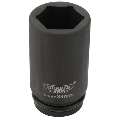 General description This is a 34mm deep impact socket designed for heavy-duty applications. It features a 3/4-inch square drive compatible with impact wrenches and tools. The socket is part of Draper's Expert series, known for durability and high performance in demanding tasks. Technical specifications Size: 34mm Drive Size: 3/4 inch (19mm) Type: Deep impact socket Number of Points: 6-point Material: High-strength steel suitable for impact use Compatibility and accessories Compatible with impact wrenches and ratchets with a 3/4-inch drive Designed for use with impact tools and sockets Installation Attach the socket to a compatible impact wrench or ratchet with a 3/4-inch drive Usage Use for tightening or loosening nuts and bolts with a 34mm size Suitable for heavy-duty automotive, construction, and industrial applications