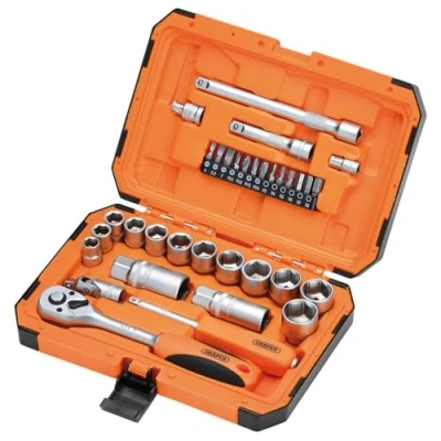 AmazonA 34-piece HI-TORQ 6 point 1/4" and 3/8" socket set, with a quick-release ratchet, suitable for all trade professionals and home DIY users Supplied in a durable, robust case with a built-in handle Sockets manufactured from hardened and tempered chrome vanadium steel Sockets and extension bars have knurl finishing for ultimate grip and handles feature a TPR coating for added comfort Draper lifetime warranty, Weight: 4.31224184472 Pounds, Manufacturer: Draper