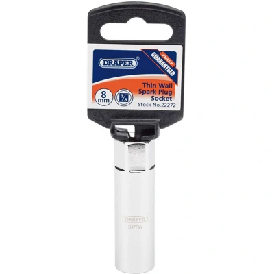 General description This Draper 8mm Thread (14mm Socket) 3/8' Square Drive Thin Wall Hi-Torq™ 12 Point Spark Plug Socket is designed for effective spark plug removal and installation. It features a rubber insert that provides plug protection and retention, making it suitable for use with various vehicles, including most Citroën models, Peugeot 207, 307, Renault 1.2 16v, BMW, BMW Mini, and Mercedes with limited clearance. Technical specifications Thread size: 8mm Socket size: 14mm Drive type: 3/8' Square Drive Socket length: 65mm Material: Chrome vanadium steel, hardened, tempered, chrome plated, and polished