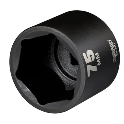 General description This is a high-quality deep impact socket designed for use with electric or pneumatic impact wrenches. Made from hardened chrome molybdenum steel, it offers durability and strength for heavy-duty applications. The socket features a 6-point design for a secure grip on fasteners and a black phosphate finish for corrosion resistance. It is suitable for professional and DIY use in home improvement and automotive tasks. Technical specifications Material: Hardened chrome molybdenum steel Design: 6-point deep impact socket Drive Size: 1 inch (square drive) Socket Size: 75mm Finish: Black phosphate coating for corrosion protection Compatibility and accessories Compatible with impact wrenches and power tools with a 1-inch drive Supplied with a ring and pin for secure attachment Installation Attach the socket to a compatible impact wrench or power tool with a 1-inch drive Ensure the socket is securely fitted before use Usage Use with impact wrenches for loosening or
