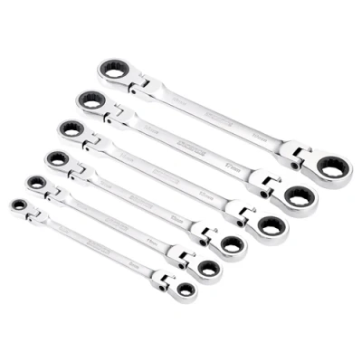 General description This set includes six high-quality double flexible head ratchet ring spanners designed for professional and DIY use. Made from hardened, tempered chrome vanadium steel, these spanners are fully polished and chrome plated for corrosion resistance. Each spanner features a 180° flexible head and a 90-tooth ratchet mechanism, allowing for precise operation in tight spaces. The 4° movement ensures easy access in confined areas, while the 12-point design maximizes torque transfer and reduces slipping or damage to fasteners. This comprehensive set covers a full range of sizes for various applications. Technical specifications Material: Chrome vanadium steel, hardened and tempered Finish: Mirror chrome plating Head: 180° flexible Ratchet mechanism: 90-tooth with 4° movement Design: 12-point for maximum torque transfer Sizes included: 8x9mm, 10x11mm, 12x13mm, 14x15mm, 16x17mm, 18x19mm Compatibility and accessories Compatible with standard metric fasteners Suitable for use