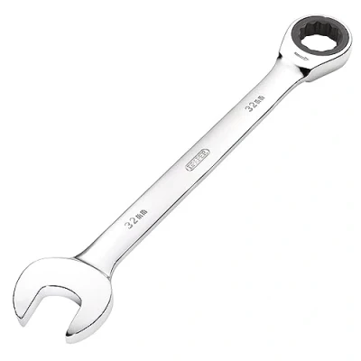 General description This is a Draper Hi-Torq 32mm metric ratchet combination spanner. It features an open end set at 15° for better access and a ring end with a 72-tooth ratcheting mechanism for smooth operation. The spanner is forged from chrome vanadium steel, then hardened, tempered, and chrome plated for durability and corrosion resistance. It is designed for professional and DIY use in various tightening and loosening tasks. Technical specifications Size: 32mm (metric) Open end angle: 15° Ratcheting mechanism: 72 teeth Material: Chrome vanadium steel Finish: Chrome plated Compatibility and accessories Compatible with standard 32mm sockets and accessories Part of Draper's Hi-Torq range of hand tools Installation No installation required; ready to use out of the box. Usage Ideal for tightening or loosening nuts and bolts in various applications Suitable for professional mechanics, technicians, and DIY enthusiasts Other information Display packed for retail sale.