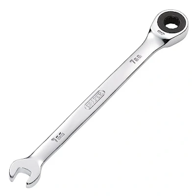 General description This is a high-quality ratcheting combination spanner designed for precise and efficient tightening and loosening of nuts and bolts. It features an open end set at a 15° angle and a ring end with a 72-tooth ratcheting mechanism for smooth operation. Made from forged chrome vanadium steel, it is hardened, tempered, and chrome plated for durability and corrosion resistance. Technical specifications Size: 7.0mm Material: Chrome vanadium steel Finish: Chrome plated Ratcheting mechanism: 72 teeth on the ring end Open end angle: 15° Compatibility and accessories Compatible with standard metric nuts and bolts Part of a set of ratcheting spanners Installation No installation required; ready to use out of the box Usage Ideal for DIY projects, home repairs, and professional applications Suitable for tightening and loosening fasteners in tight spaces thanks to the ratcheting mechanism and angled open end Other information Display packed for easy storage and organization