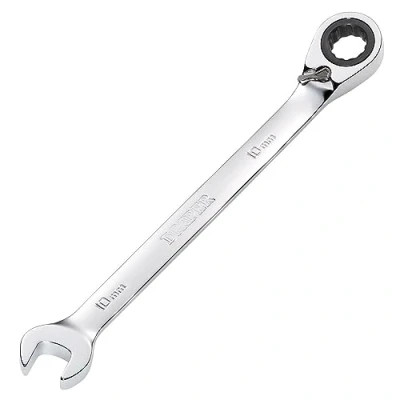 ManoManoGeneral description This Draper 10mm Hi-Torq® Metric Reversible Ratcheting Combination Spanner is designed for efficiency and ease of use. The open end is set at a 15° angle, while the ratchet ring end is also offset at 15°, allowing for better access in tight spaces. With a forward/reverse direction changer on the ring end, only a 5° movement is required to turn fasteners, making it especially useful in confined areas. Technical specifications Size: 10mm Material: Chrome vanadium steel Finish: Hardened, tempered, chrome plated, and fully polished