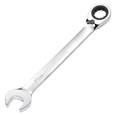 ManoManoGeneral description The Draper 19mm Hi-Torq Metric Reversible Ratcheting Combination Spanner is designed for efficiency and ease of use in tight spaces. It features an open end set at 15° and a ratchet ring end that is offset at 15°, allowing for a forward/reverse direction changer with only a 5° movement required to turn fasteners. Technical specifications Size: 19mm Material: Chrome vanadium steel Finish: Hardened, tempered, chrome plated, and fully polished