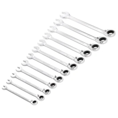 ManoManoGeneral description This 12-piece set of reversible ratchet combination spanners is designed for professional and DIY use. Made from durable chrome vanadium steel, these spanners are hardened, tempered, fully polished, and corrosion-resistant. The open ends are offset at 15°, and the ring ends feature a 15° cranked head with a 90-tooth ratchet mechanism, allowing for a quick 4° movement in tight spaces. The ring ends also have a forward and reverse lever for easy switching. The 12-point design provides maximum torque transfer and reduces the risk of slipping or damaging fasteners. Technical specifications Material: Chrome vanadium steel Number of pieces: 12 Open end offset: 15° Ring end: 15° cranked head with 90-tooth ratchet mechanism Ratchet movement: 4° Design: 12-point Compatibility and accessories Compatible with standard metric fasteners Suitable for use with various socket sets and accessories Installation No installation required; ready to use out of the box Usage Use the open