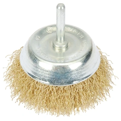 General description This product is a brassed steel crimped wire cup brush designed for light to medium-duty cleaning and surface preparation. It effectively removes rust, paint, and other residues from various surfaces. The brush features hardened dipped brassed steel bristles that offer high durability and resistance to oxidation. Its cup shape allows for efficient coverage of large surface areas and can be used flat against surfaces for thorough cleaning. Technical specifications Diameter: 75mm Shank size: 6.35mm hex Material: Hardened dipped brassed steel wire Compatibility and accessories Compatible with most drill drivers and drills with a 13mm chuck Suitable for use on metal, wood, and other surfaces requiring light to medium abrasion Installation Ensure the drill is turned off before installation Insert the 6.35mm hex shank into the drill chuck Secure tightly to prevent slipping during use Usage Use the brush at appropriate speeds for effective cleaning Apply even pressure to