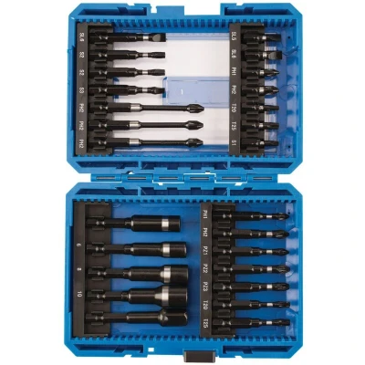 General description This is a high-quality impact screwdriver bit set designed for use with impact drivers. It includes a variety of bits suitable for different screw types and sizes, all manufactured from durable S2 steel that is correctly hardened and tempered for long-lasting performance. The set is supplied in a sturdy plastic case with soft grip details for easy storage and transport. Technical specifications Material: S2 steel, hardened and tempered Finish: Phosphate coating Set includes: 26 pieces Bit sizes vary from 25mm to 75mm in length Compatibility and accessories Designed for use with impact drivers Includes a magnetic bit holder Includes a 1/4 hex to 1/4 square drive adaptor Bits cover flat, cross, PZ, TX star, square, and nut-driver types Installation Insert the desired bit into the impact driver or the magnetic bit holder Ensure the bit is securely fitted before use Usage Use with impact drivers for driving screws and fasteners Suitable for DIY projects, home