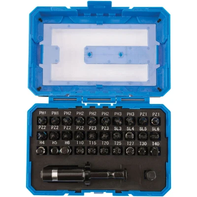 General description This is an impact screwdriver bit set designed for use with impact drivers. It includes 32 high-quality bits made from S2 steel, which are correctly hardened and tempered for durability. The bits feature a phosphate finish for corrosion resistance. The set is supplied in a sturdy plastic case with soft grip details for easy handling and storage. Technical specifications Number of pieces: 32 Material: S2 steel Finish: Phosphate coating Drive size: 1/4 inch hex Compatibility and accessories Compatible with impact drivers that accept 1/4" hex bits Includes a plastic case for storage and transport Installation Insert the desired impact screwdriver bit into the impact driver’s chuck or bit holder Ensure the bit is securely fitted before use Usage Use with impact drivers for driving screws and fasteners Suitable for heavy-duty applications requiring high torque Handle with care to avoid damaging the bits or the tool