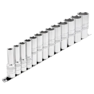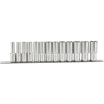 General description This is a set of 13 deep sockets with a 1/2" square drive, designed for use with compatible ratchets and extensions. The sockets are made from chrome vanadium steel, ensuring durability and strength. Each socket features a micro satin chrome finish for corrosion resistance and a knurled ring for enhanced grip. The set is supplied on a sturdy metal rail for organized storage and easy access. Technical specifications Number of pieces: 13 Drive size: 1/2 inch Material: Chrome vanadium steel Finish: Micro satin chrome Manufactured according to DIN3122 and ISO3315 standards Compatibility and accessories Compatible with 1/2" drive ratchets, extensions, and other drive tools Supplied with a metal rail for secure storage and organization Installation Simply attach the socket to a compatible 1/2" drive ratchet or extension for use Usage Ideal for tightening or loosening nuts and bolts in deep or recessed areas Suitable for professional and DIY home improvement projects