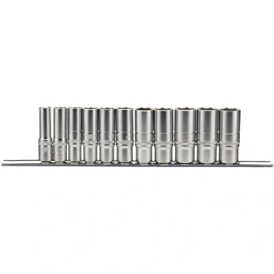 General description This is a high-quality deep socket set designed for professional and DIY use. Made from chrome vanadium steel, these sockets are hardened and tempered for durability and strength. The set includes 11 pieces with a 3/8" square drive, suitable for various automotive and mechanical applications. Each socket features a micro satin chrome finish and a knurled ring for enhanced grip during use. Technical specifications Set includes 11 deep sockets Drive size: 3/8" square Material: Chrome vanadium steel Finish: Micro satin chrome Manufactured and tested according to DIN3122 and ISO3315 standards Compatibility and accessories Compatible with 3/8" drive ratchets and extensions Suitable for use with various socket wrenches and tools Installation Insert the socket onto a compatible 3/8" drive ratchet or extension Ensure the socket is securely attached before use Usage Use for tightening or loosening nuts and bolts Ideal for automotive repairs, machinery maintenance, and DIY